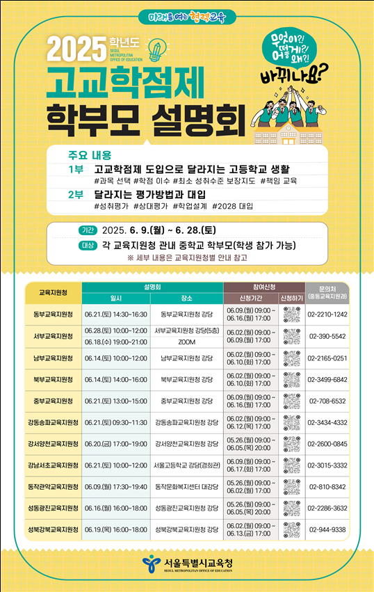 이어지는 2부에서는 서울시교육청 소속 대학진학지도지원단 교사 및 장학사가 내신 평가방식의 변화 방향을 소개하고, 2028학년도 대학입시를 겨냥한 학업 설계 전략까지 폭넓게 설명한다. 고등학교 선택과 대입 준비가 사실상 중학교 시절부터 시작된다는 현실을 반영해, 실질적인 진로 설계와 과목 선택 조언이 집중 제공될 예정이다.
