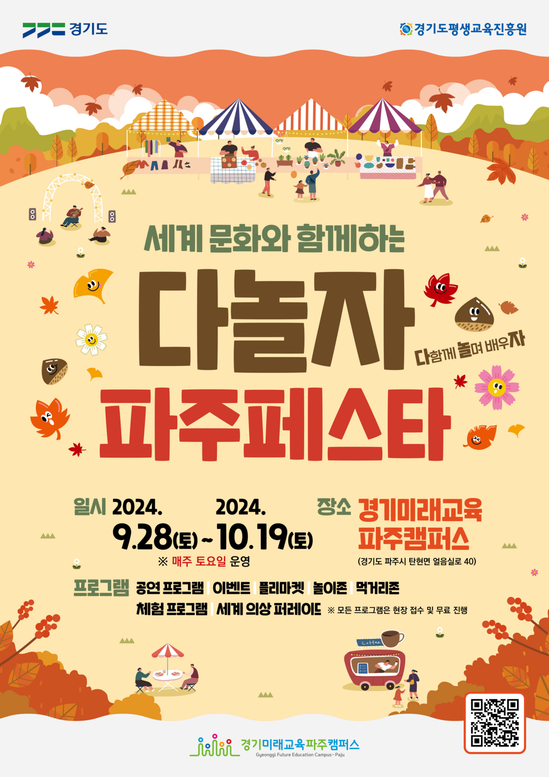 [피앤피뉴스=마성배 기자] 경기도가 주최하는 ‘다놀자 파주페스타’가 9월 28일부터 10월 19일까지 매주 토요일 경기미래교육파주캠퍼스에서 열린다.