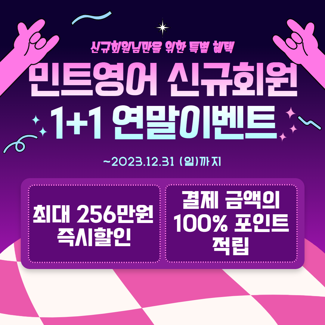 [피앤피뉴스=마성배 기자] 전화·화상영어 브랜드 민트영어가 신규회원에게 12월 31일까지 최대 256만원 할인과 함께 결제금액의 100% 포인트 적립을 통해 기존 수업 횟수에서 최소 2배 더 들을 수 있는 1+1 이벤트를 진행한다.