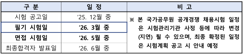 내년 시험은 오는 12월 중 시험 공고를 시작으로, 필기시험은 2026년 3월, 면접시험은 5월, 최종 합격자 발표는 6월 중에 진행될 예정이다. 다만, 국가공무원 공개경쟁채용 일정 및 시험관리기관의 사정에 따라 일정이 일부 변경되거나 지연될 가능성도 있다.