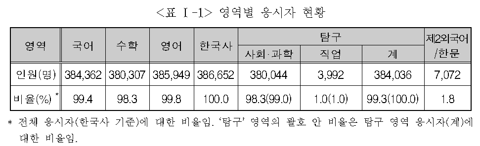 국어, 수학, 영어 영역에 모두 응시한 수험생은 전체 응시자의 98.1%인 37만 9,164명이었으며, 이 중 탐구 영역까지 포함해 응시한 수험생은 97.5%인 37만 7,098명으로 집계됐다.