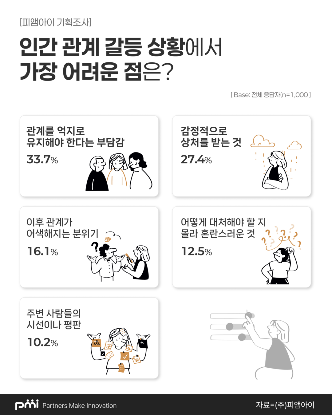 이러한 갈등 상황에서 가장 어려운 점으로는 ‘억지로 관계를 유지해야 한다는 심리적 부담’(33.7%)이 가장 많이 언급됐고, 그 외에도 ▲‘감정적 상처’(27.4%) ▲‘이후 어색한 관계’(16.1%) ▲‘대처 방식에 대한 혼란’(12.5%) ▲‘주변의 시선과 평판’(10.2%) 등이 있었다.