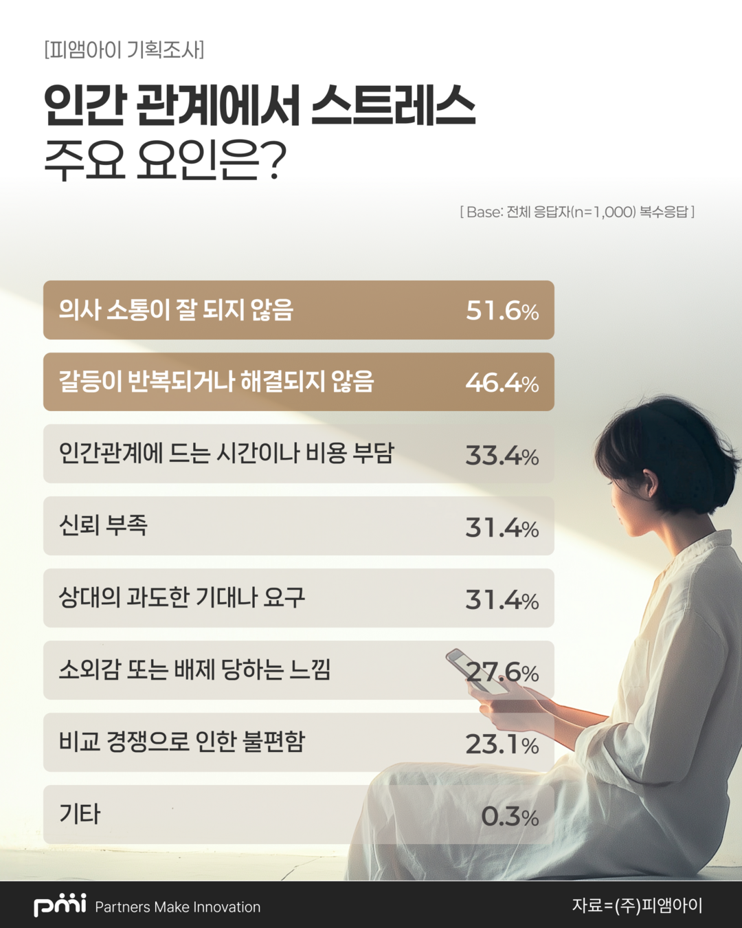 인간관계 스트레스를 유발하는 요인으로는 단연 ‘의사소통의 부재’(51.6%)가 가장 많이 지목됐다. 이어 ▲‘반복되거나 해결되지 않는 갈등’(46.4%) ▲‘관계 유지에 드는 시간·비용 부담’(33.4%) ▲‘상대방에 대한 신뢰 부족’(31.4%) ▲‘과도한 기대나 요구’(31.4%) ▲‘소외감 또는 배제된 느낌’(27.6%) 등이 뒤를 이었다.