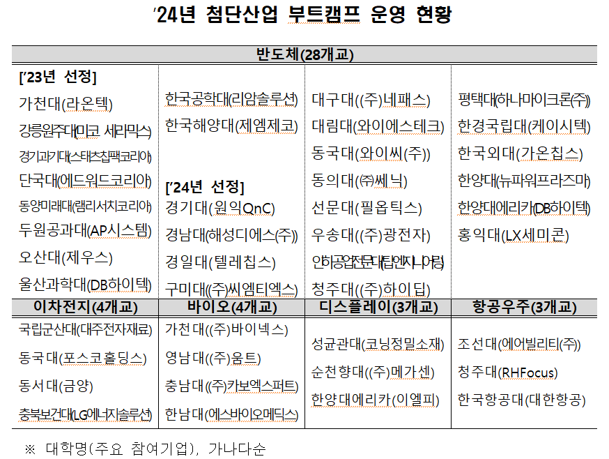첨단산업 인재양성 부트캠프는 대학이 기업과 협력하여 반도체, 이차전지, 디스플레이, 바이오, 항공우주 등 첨단산업 분야에 취업을 희망하는 학생에게 단기 집중교육 프로그램을 제공하는 사업으로, 지난해에는 10개 대학에서 반도체 분야 중심으로 시작했으며, 올해는 42개 대학으로 확대되어 5개 분야에서 운영된다.