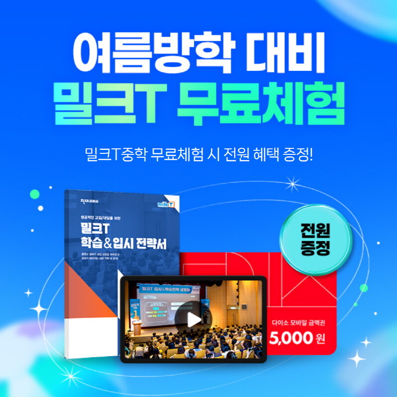 이번 여름방학 대비 무료체험 이벤트에서는 신규 체험 회원 전원에게 다이소 모바일 금액권과 밀크T 학습 전략서, 전략 특강 등 푸짐한 혜택이 제공할 예정이다.