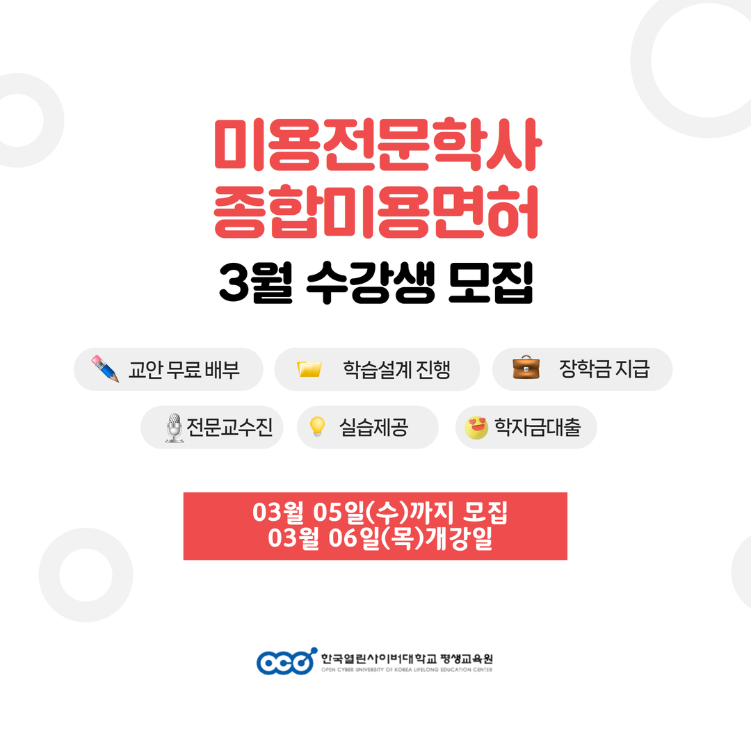 [피앤피뉴스=이수진 기자] 한국열린사이버대학교 평생교육원은 2025년 3월 5일(수)까지 미용전문학사 종합미용면허증 과정 수강생을 모집할 계획이다. 3월 6일(목) 개강하는 본 과정은 미용 분야 전문가를 꿈꾸는 분들에게 체계적인 커리큘럼과 다양한 혜택을 제공할 계획이다.
