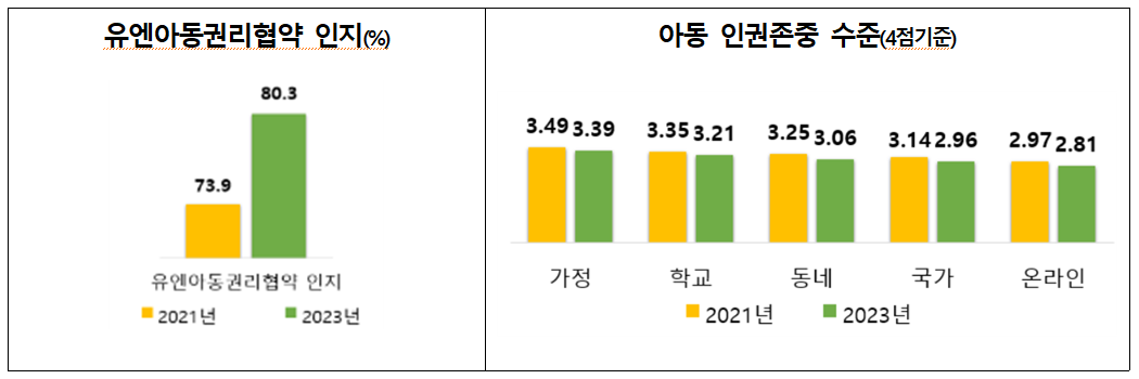 아동의 권리에 대한 인식은 전반적으로 개선되었으며, 인권존중 수준은 가정에서 가장 높고 온라인에서 가장 낮게 나타났다. 유엔아동권리협약을 인지하는 아동 비율은 80.3%로, 2021년 조사 대비 증가했다.