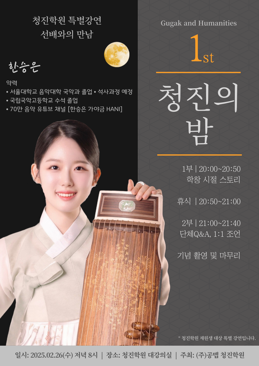지난 2월 26일, (주)공맵이 운영하는 청진학원이 국악중·고등학교 학생 재원생 대상으로 특별 강연을 개최했다. 이번 강연은 국악을 전공하는 학생들이 학업과 진로를 효과적으로 준비할 수 있도록 돕기 위해 기획됐다.