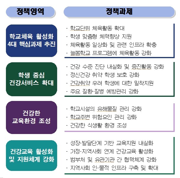 첫째, 학생들이 건강하게 성장할 수 있도록 체육활동 참여 기회를 증가시키기 위해 학교체육 활성화 4대 핵심과제를 추진한다는 방침이다. 하지만 초등 1~2학년 체육 교과 분리, 중학교 학교스포츠클럽 활동 확대 등과 같은 교육과정 개정이 필요한 사항은 국가교육위원회에 제안해 논의하되 “타 교과에 미치는 영향이 없도록 한다”는 원칙을 준수한다.