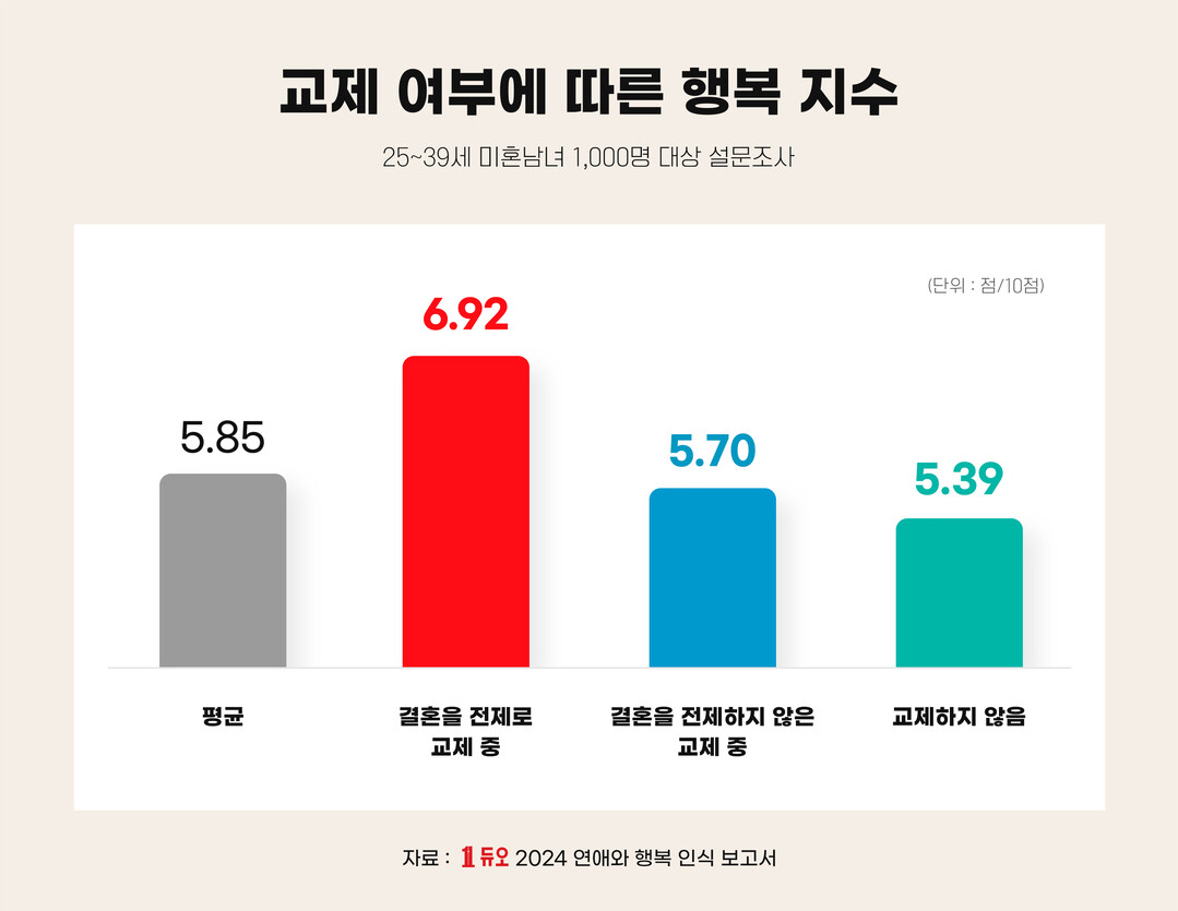 행복지수는 ‘결혼을 전제로 교제 중(이하 결혼 교제)’일 때 6.92점으로 가장 높았다. 결혼을 전제하지 않은 교제 중일 때 행복지수는 5.70점, 교제하지 않을 때 행복지수는 5.39점이었다.