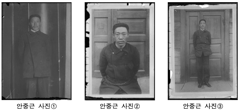 첫 번째 사진은 1909년 10월 26일 러시아 당국에 체포된 직후, 동청철도 헌병관리국 조사실에서 촬영된 것으로 추정된다. 포박되지 않은 채 당당히 서 있는 모습이 인상적이다.