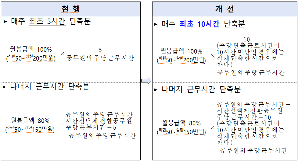 시간선택제공무원(주당 15~35시간 근무)으로 전환한 공무원들의 소득보전이 강화될 전망이다. 육아를 위해 근로시간을 단축한 공무원에게 지급하는 육아기 근로시간 단축수당의 지원 구간도 확대된다. 기존에는 주당 최초 5시간에 대해 월봉급액의 100%를 지원했으나, 개정안에서는 주당 최초 10시간까지 월봉급액의 100%를 지원, 상한액은 200만 원이다.