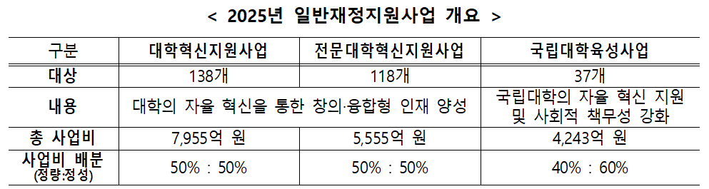 핵심은 전국 일반대 138개교, 전문대 118개교, 국립대 37개교를 대상으로 한 ‘자율 혁신’과 ‘성과 중심’ 재정지원 구조로, 교육부는 이를 통해 대학이 현장 중심의 실용 교육과 융합형 인재 양성에 집중할 수 있도록 유도할 계획이다.