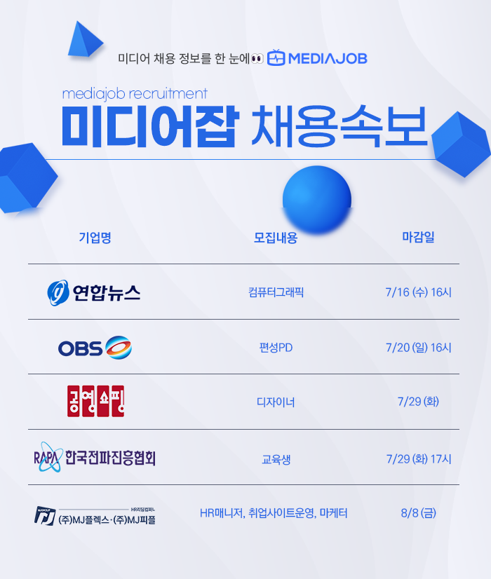 [피앤피뉴스=마성배 기자] 방송·미디어 분야 취업을 준비하는 구직자들을 위한 다양한 채용 기회가 열리고 있다. 미디어 분야 전문 채용 플랫폼 ‘미디어잡’은 최근 연합뉴스TV, OBS, 공영홈쇼핑, 한국전파진흥협회, MJ플렉스·MJ피플 등 주요 방송·콘텐츠 기업의 신규 채용 정보를 공개했다.