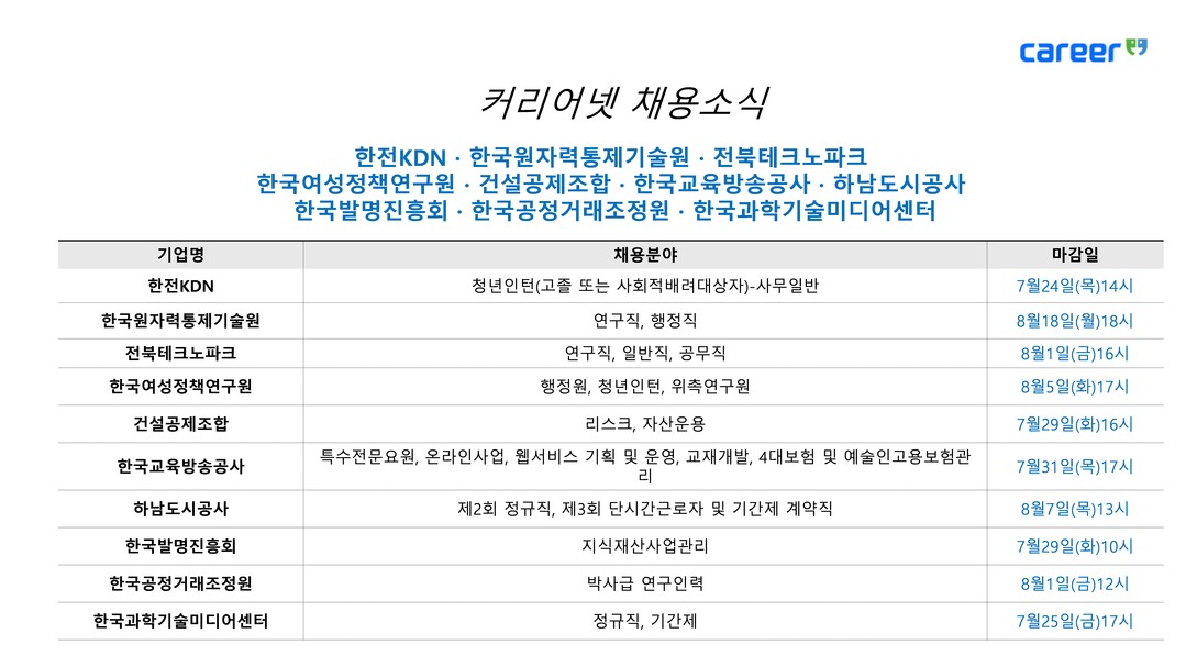 취업 포털 커리어는 23일, 공공기관과 협단체 10곳이 진행 중인 채용 소식을 일제히 발표했다.