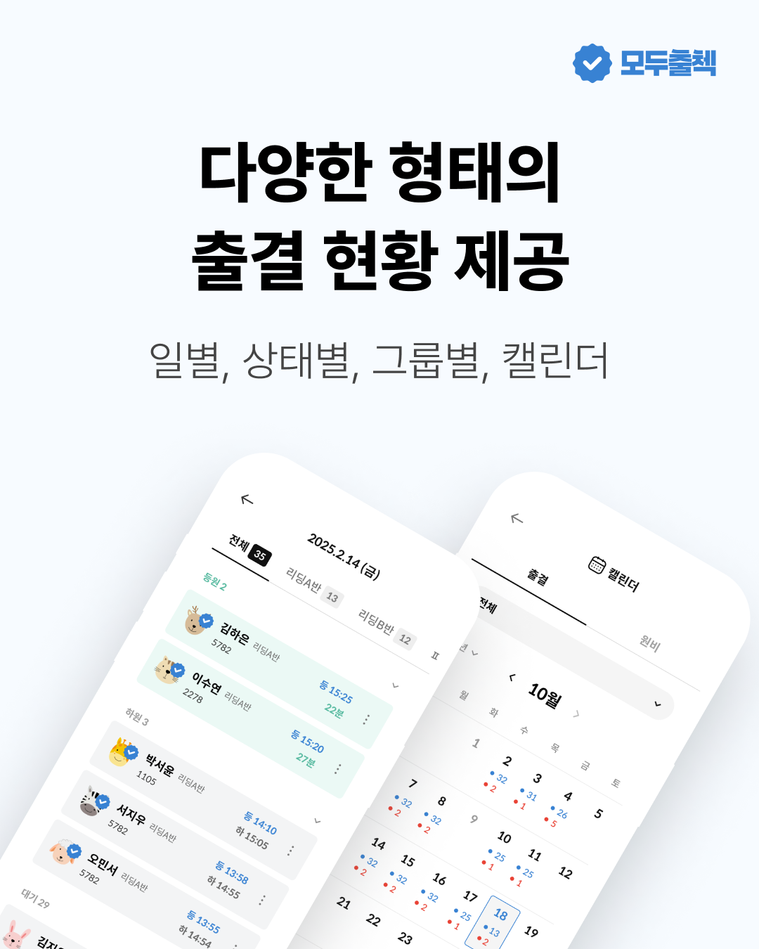 ‘모두출첵’은 학생 등하교 및 수업 출결 상황을 모바일로 실시간 기록하고, 카카오 알림톡 또는 문자메시지로 학부모에게 즉시 전달하는 기능을 제공한다. 또한, 출석부, 수강생 명단 등 교육청 제출용 서류를 자동으로 엑셀 형식으로 출력할 수 있어, 학교 행정 부담을 크게 덜어주는 장점이 있다.