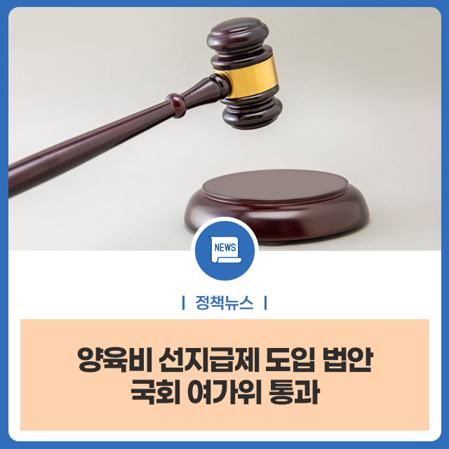 여성가족부는 양육비 선지급제 도입을 주요 내용으로 하는 ‘양육비 이행확보 및 지원에 관한 법률’ 개정안이 국회 여성가족위원회 전체회의를 통과했다고 23일 밝혔다.