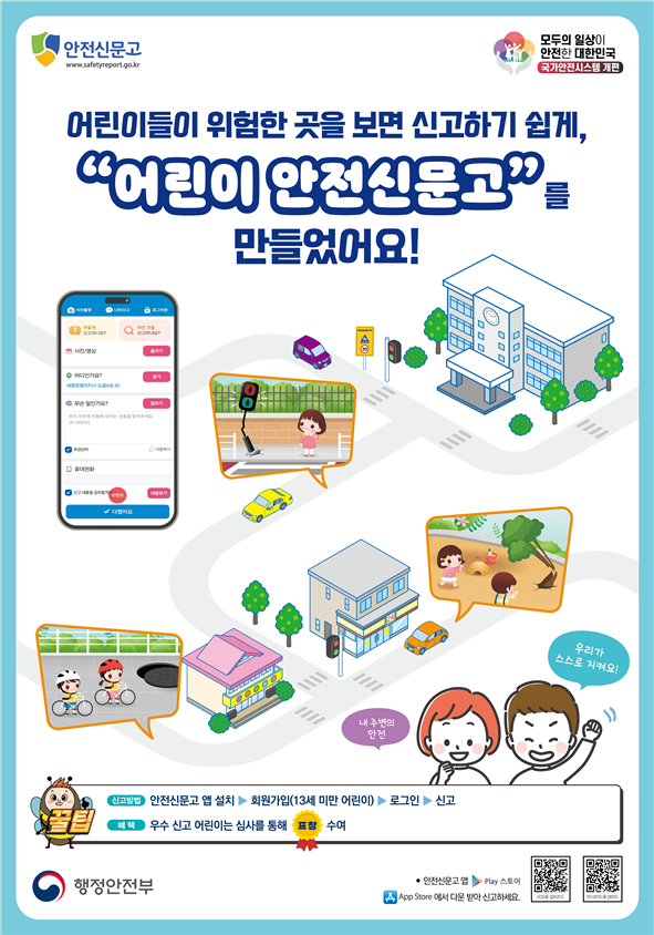 황기연 행정안전부 예방정책국장은 “어린이들이 주체가 되어 위험 요소를 직접 찾아내고 알리는 과정 자체가 곧 사고 예방 교육이자 안전의식 향상”이라며, “앞으로도 어린이 눈높이에 맞춘 플랫폼으로 안전신문고를 지속 개선해 나가겠다”고 밝혔다.