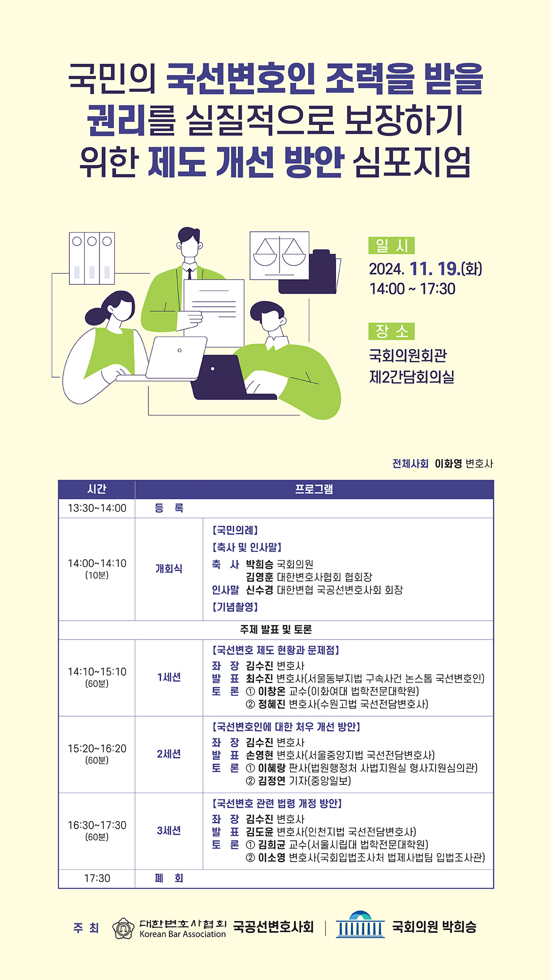 제3세션에서는 인천지법 김도윤 변호사가 국선변호 관련 법령 개정 방안을 발표하며, 서울시립대 김희균 교수와 국회 입법조사처 이소영 변호사가 구체적인 입법 방향과 필요성을 논의했다.