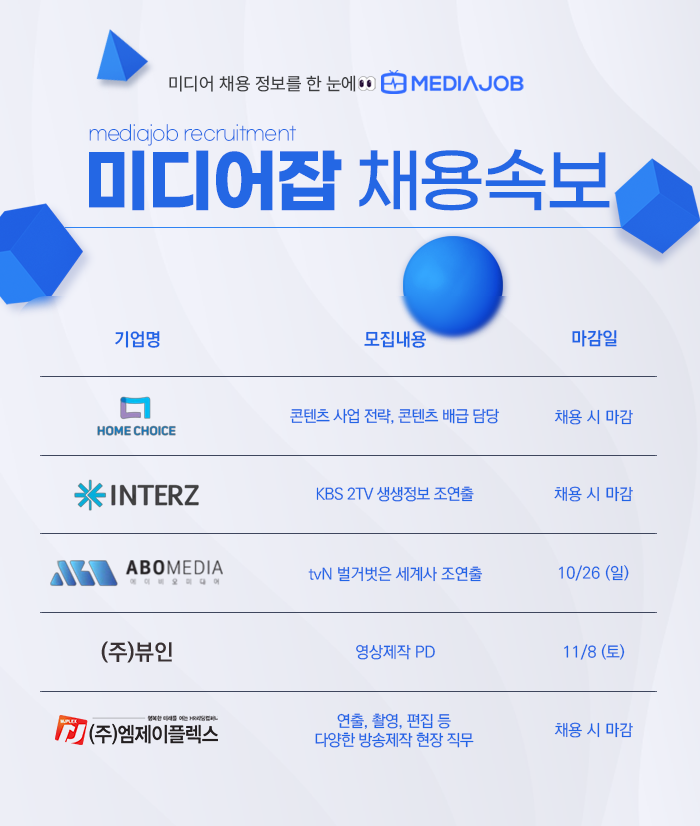 이번 채용에는 홈초이스, 인터즈, ABO미디어, 뷰인, 엠제이플렉스 등 방송·영상 콘텐츠 업계 주요 기업들이 참여해, 제작 현장과 콘텐츠 기획 분야에서 다양한 인재를 모집하고 있다.