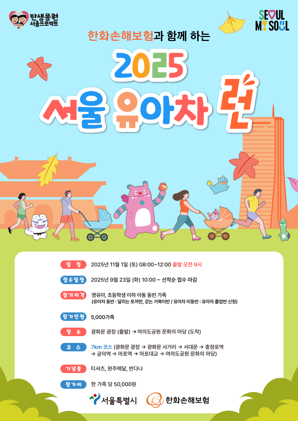 참가 신청은 9월 23일(화) 오전 10시부터 10월 16일(목) 오후 6시까지 공식 누리집(www.seoulstrollerrun.co.kr)을 통해 선착순으로 받는다. 참가비는 가족당 5만 원이며, 일부 금액은 한부모가족 지원에 기부된다.
