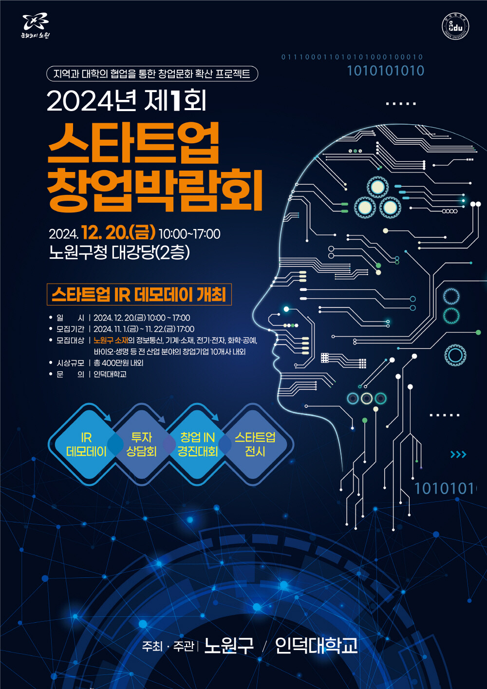 투자, 자금조달 등 창업기업의 애로사항 해결을 위한 현장 상담 ‘투자 상담회’와 노원구 소재 예비창업자의 아이템에 대한 경진대회 진행 및 300만원 규모의 경진대회 시상, 참여기업의 아이템, 제품 홍보 및 전시를 진행하는 ‘창업 IN(Induk & Nowon) 경진대회’도 마련됐다. 대회에 참여한 기업, 창업유관기관 추천 기업 등을 대상으로 20개 내외 부스를 운영해 창업아이템을 홍보하는 ‘스타트업 전시’도 주요 프로그램으로 진행된다.