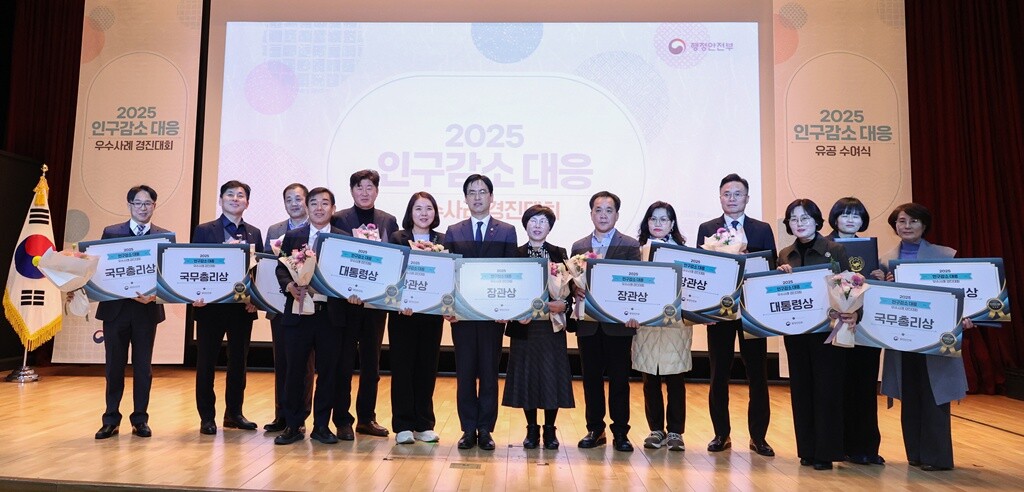 | ▲김민재 행정안전부 차관이 18일 오후 정부세종청사 15동 대강당에서 열린 ‘2025년 인구감소 대응 우수사례 경진대회’에서 지역균형발전과 지역활성화에 기여한 기관·개인에게 ‘인구감소 위기 대응 유공’ 포상을 수여한 뒤 수상자들과 기념촬영을 하고 있다.(사진: 인사혁신처) |
