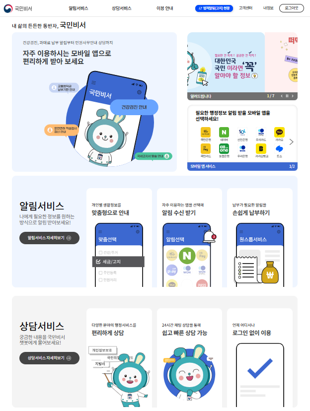 국민비서는 국민이 따로 검색하거나 문의하지 않아도, 행정기관이 보유한 정보를 기반으로 생활에 꼭 필요한 정보를 미리 안내해주는 ‘찾아가는 알림 서비스’다. 2021년 서비스를 시작한 이후 건강검진 일정, 교통 과태료, 전기요금, 국세 고지서 발송 등 다양한 분야에서 국민들의 생활 편의를 높여왔다.