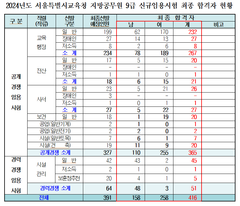[피앤피뉴스=마성배 기자] 서울시교육청은 10일 ‘2024년도 서울특별시교육청 지방공무원 9급 공개(경력)경쟁임용시험’ 최종 합격자 416명의 명단을 시교육청 누리집을 통해 발표했다.