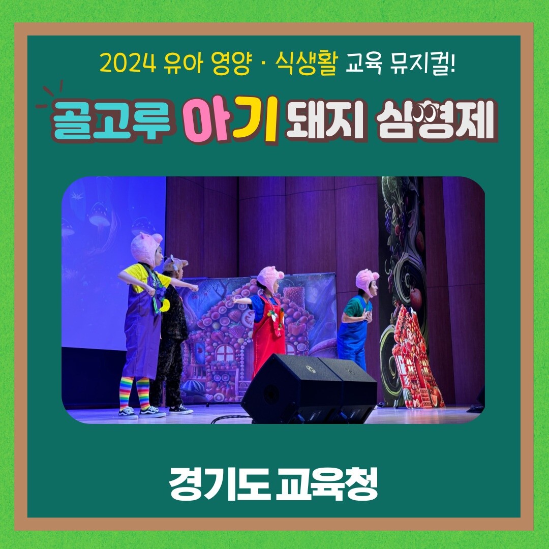 경기도교육청은 오늘(28일) 북부청사에서 ‘알록달록 아기 돼지 삼 형제’라는 주제의 유아 맞춤형 영양·식생활 교육 뮤지컬 공연을 개최한다. 이번 행사는 유치원 8곳에서 온 원아 423명을 대상으로 오전 10시 30분과 오후 2시에 두 차례 진행된다.