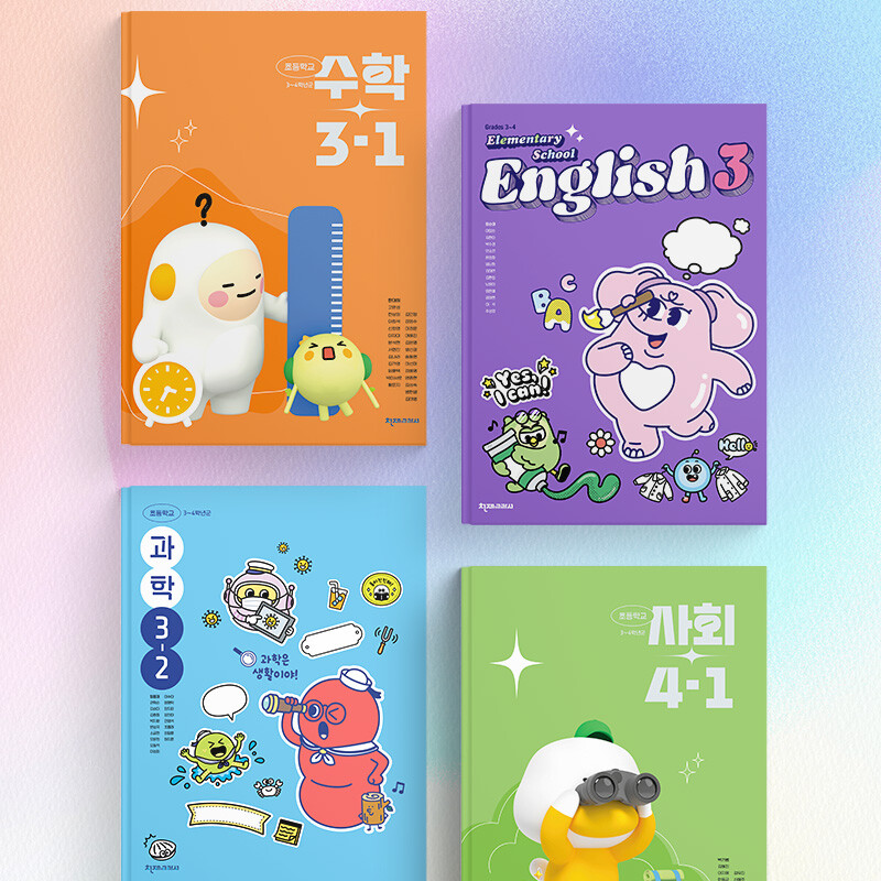 초등 교과서는 표현력과 상상력을 자극하는 두 가지 표지 디자인 콘셉트를 통해 학습의 흥미를 끌어올렸다. ‘다꾸(다이어리 꾸미기)’ 콘셉트는 비어 있는 말풍선과 스티커 형태의 캐릭터로 구성되어, 학생이 직접 꾸미는 과정을 통해 창의적 표현을 유도하고 교과서에 대한 애착을 자연스럽게 형성한다. 또한 ‘3D 피규어 캐릭터’ 콘셉트는 입체적으로 표현된 캐릭터의 다양한 표정과 동작을 통해 학습 내용을 상징적으로 전달하며, 학생들에게 친근한 시각적 요소로 몰입감과 흥미를 더한다.