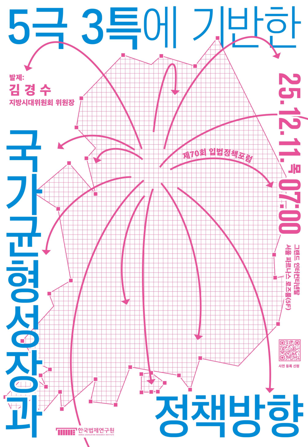 [피앤피뉴스=마성배 기자] 한국법제연구원(원장 한영수)이 오는 11일 오전 7시, 서울 그랜드 인터컨티넨탈 파르나스 로즈룸에서 제70회 입법정책포럼을 열고 김경수 대통령직속 지방시대위원회 위원장을 발제자로 초청한다. 김 위원장은 이날 포럼에서 ‘5극 3특에 기반한 국가균형성장과 정책방향’을 주제로 수도권 집중 해소와 권역별 성장축 재편의 필요성을 제시할 예정이다.