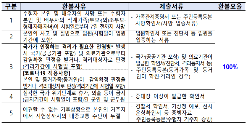 ○ (환불대상) 국가기술자격 접수취소 기간* 종료 후 아래 환불사유에 해당하여 시험에 응시하지 못한 자