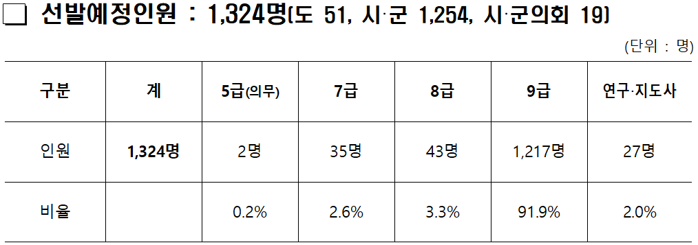 직렬별로는 △행정9급이 487명(36.8%)으로 가장 많고, △시설9급 198명 △사회복지9급 93명 △공업9급 62명 등이 뒤를 잇는다. 기관별로는 △도 직속기관 및 본청 51명 △시·군청 1,254명 △시·군의회 19명을 선발하며, 퇴직 인원과 지역별 민생 현장 인력 수요를 종합적으로 반영해 선발 인원을 확정했다.