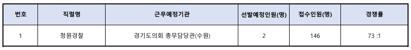 [피앤피뉴스=마성배 기자] 2024년도 제1회 경기도 청원경찰 신규채용 원서접수 결과, 2명 모집에 146명이 지원해 73대 1의 경쟁률을 기록했다.