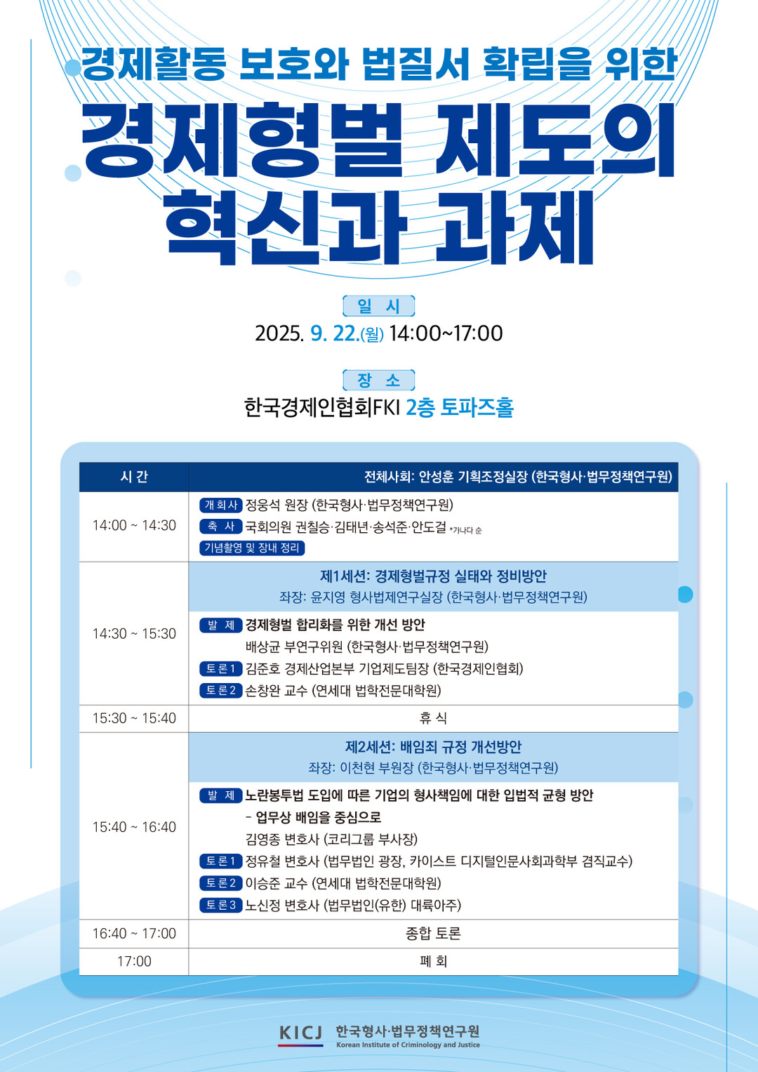 한국형사·법무정책연구원은 이번 세미나를 통해 “대통령이 강조한 정책 기조에 부응하면서 경제와 형사정책이 균형을 이루는 합리적 제도 개편 필요성을 사회 각계와 공유하겠다”며, 정책적·입법적 제언을 발굴하는 계기로 삼을 계획이라고 밝혔다.