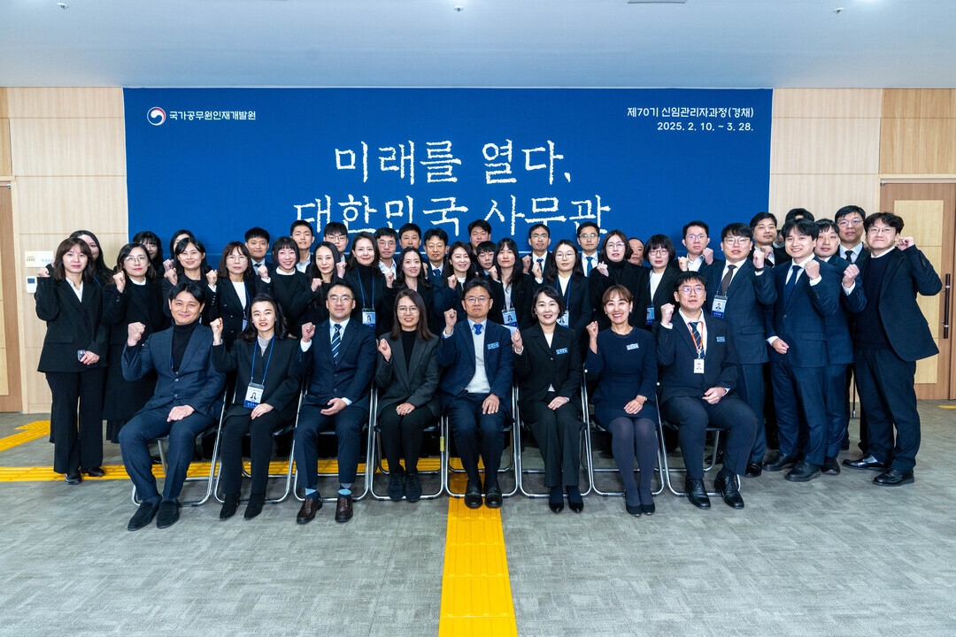 ▲2025년 2월 10일 국가공무원인재개발원(진천)에서 개최된 '제70기 신임관리자과정(경채) 입교식'에서 국가인재원 간부들 및 입교생들이 기념 촬영을 하고 있다. 국가공무원인재개발원 제공