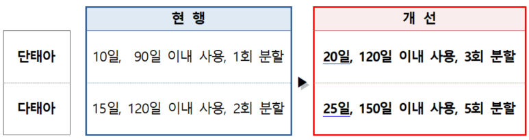 특히, 다태아(쌍둥이 이상)를 출산한 경우 기존 15일이었던 배우자 출산휴가가 25일로 확대되며, 사용기한 역시 120일에서 150일로 연장된다. 분할 사용 횟수도 3회에서 5회로 증가해 더욱 유연한 휴가 사용이 가능해졌다.