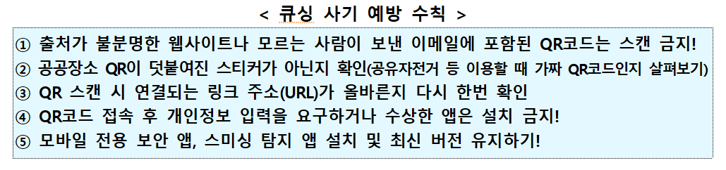 큐싱 예방 수칙으로는 ▲출처가 불분명한 QR코드 스캔 금지 ▲공공장소에서 QR코드 위조 여부 확인 ▲QR 스캔 후 연결된 링크의 주소 확인 ▲개인정보 입력 요구 시 주의 ▲모바일 보안 앱 설치 등이 제시됐다.