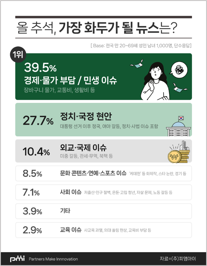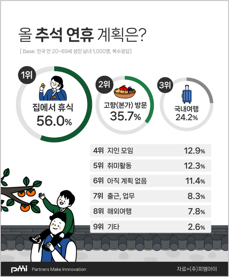 데이터 컨설팅 기업 ㈜피앰아이(PMI)는 전국 만 20~69세 성인 남녀 1,000명을 대상으로 실시한 ‘2025 추석 연휴 인식 조사’ 결과를 1일 공개했다.