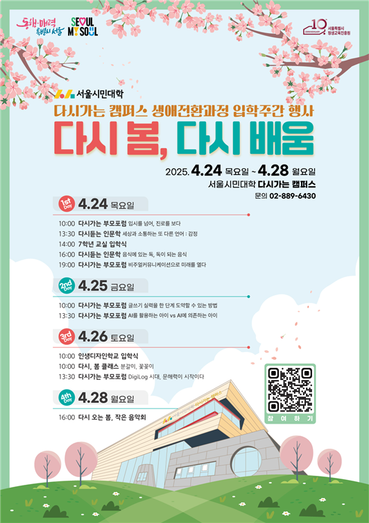 특히 이번 행사는 입학 대상자뿐 아니라 서울시민 누구에게나 개방된 열린 배움의 장으로, 4월 8일부터 온라인 선착순으로 접수할 수 있다. 자세한 일정은 서울시평생학습포털과 행사 전용페이지(다시가는.com)에서 확인 가능하다.