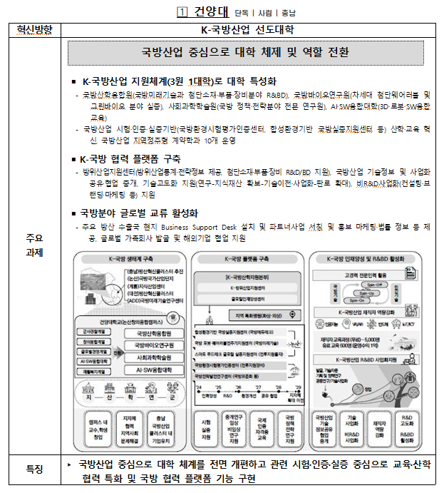 건양대학교는 국방산업 중심으로 대학 체계를 전면 개편하고 국방산업 관련 시험·인증·실증 중심의 교육 및 산학협력을 특화시켰다.