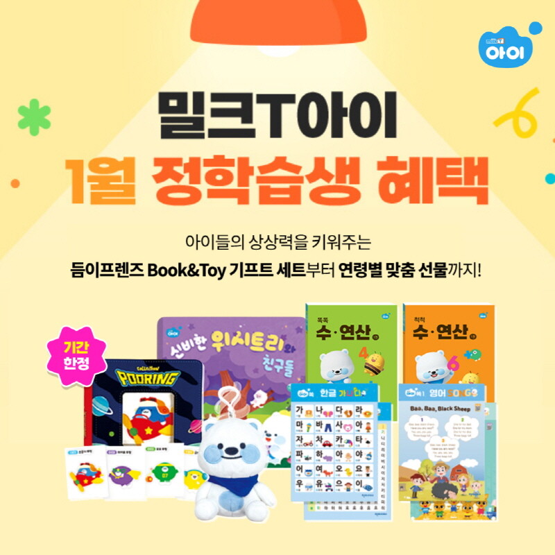 1월 신규 정학습생 혜택으로 제공되는 북앤토이 기프트 세트는 새롭게 출시된 상품으로 아이들이 좋아하는 밀크T 인기 캐릭터를 굿즈로 제작해 소장 가치를 높였으며, 실제 학부모와 아이들 사이에서도 긍정적인 반응을 얻고 있다.