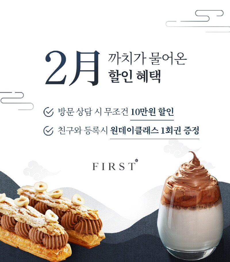 이번 한 달 동안 퍼스트바리스타·제과제빵학원에 방문하여 상담을 하는 이들에게는 2024 세뱃돈의 일환으로 수강료 10만원 할인 혜택을 제공한다. 만약 가족, 친구와 함께 강좌를 등록할 시 원데이클래스 1회권도 주어진다.