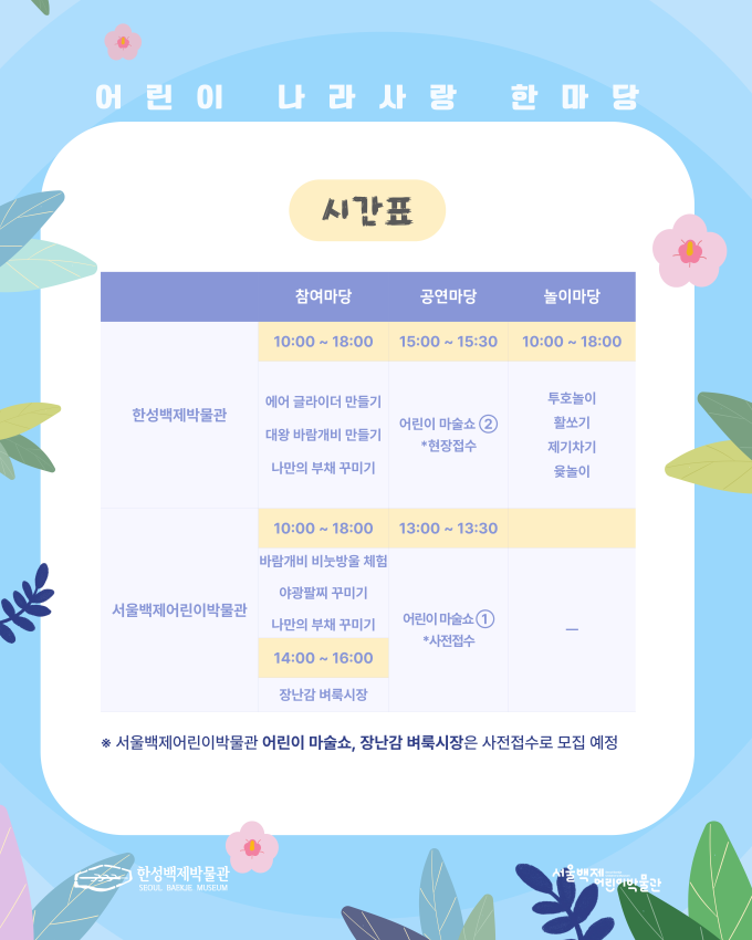 아이들의 눈높이에 맞춘 마술 공연도 열린다. 오후 1시에는 서울백제어린이박물관, 오후 3시에는 한성백제박물관에서 어린이 마술쇼가 펼쳐지며, 사전 예약은 서울시공공서비스예약을 통해 5월 26일부터 신청 가능하다. 각 회차당 100명(사전접수 70명, 현장접수 30명)이 관람할 수 있다.