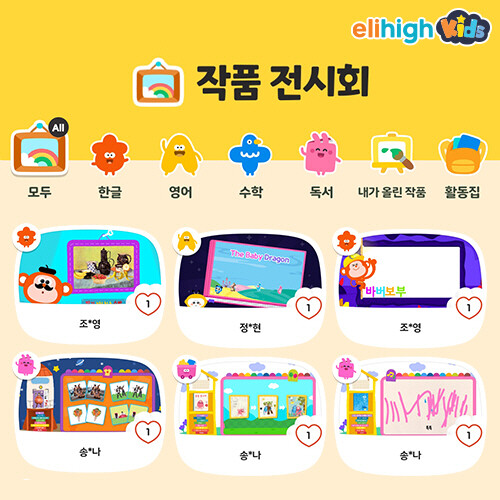 엘리하이 키즈의 ‘작품 전시회’ 메뉴에서는 아이가 한글, 영어, 수학, 독서 콘텐츠를 학습하는 과정에서 만든 결과물을 하나의 작품처럼 전시하고, 다른 친구들의 작품도 구경할 수 있다.