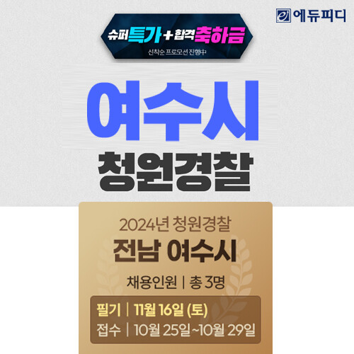 [피앤피뉴스=마성배 기자] 종합교육기업 에듀피디가 11월 16일(토) 필기 치러지는 전남 여수시 청원경찰 채용 필기·체력·면접 시험에 모두 대비할 수 있는 전 과목 ‘합격패키지’ 강의와 ‘슈퍼특가+합격축하금’ 프로모션을 함께 오픈하고 수강생을 모집한다고 밝혔다.