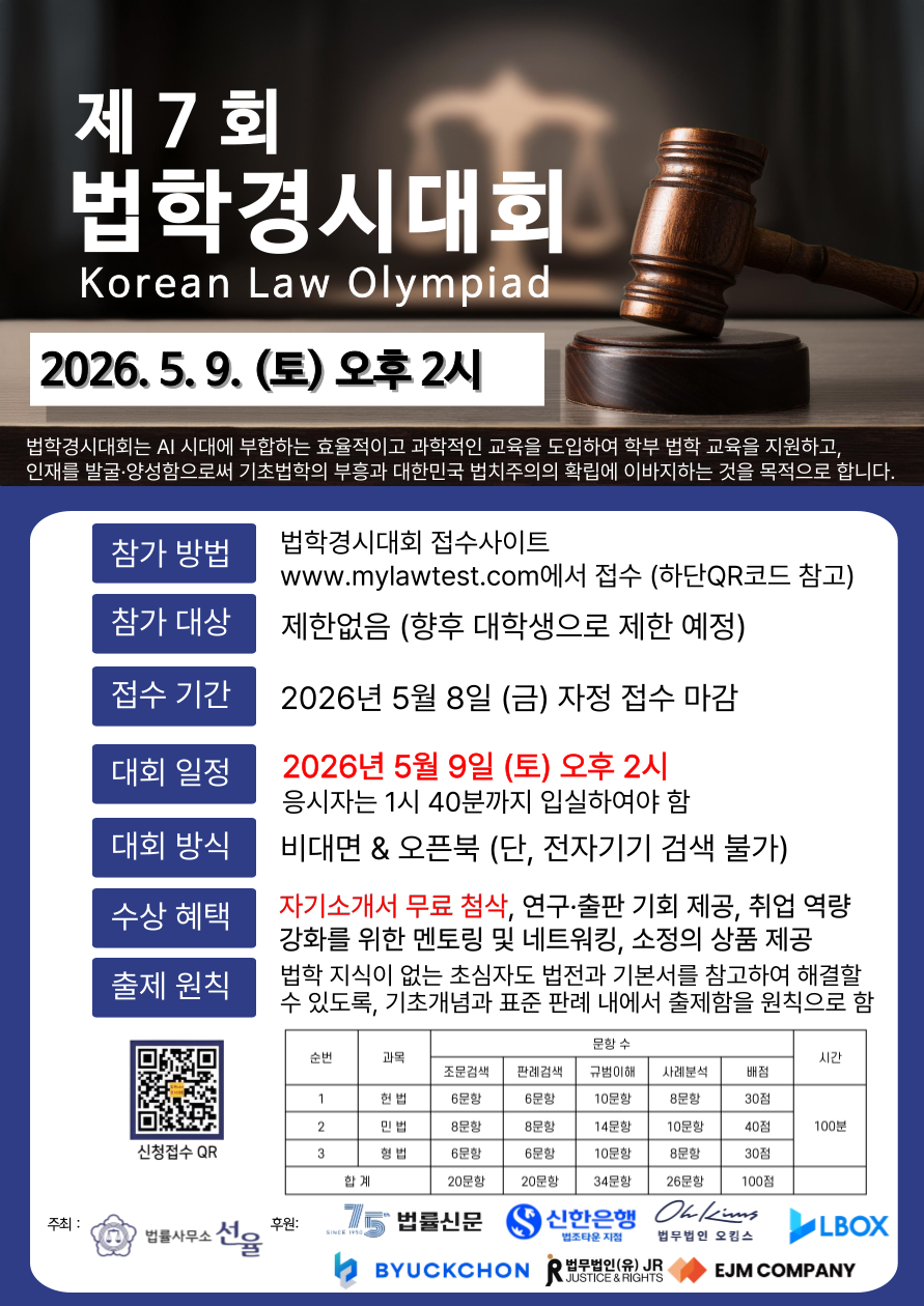 한편 제7회 법학경시대회는 오는 5월 9일 오후 2시 개최될 예정이다. 시험은 헌법과 민법, 형법을 범위로 비대면·오픈북 방식(전자기기 사용 금지)으로 진행되며, 7회 대회부터는 벽촌, 법무법인(유) JR, 이에이엠 컴퍼니가 후원사로 추가로 참여할 예정이다.