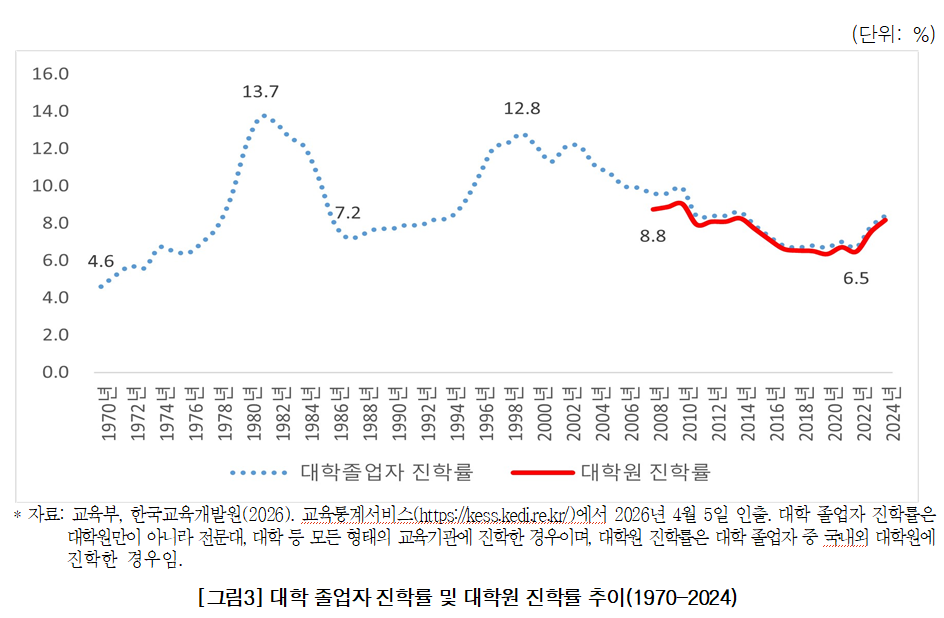 이 결과는 최근 몇 년간 교육 현장에서 반복적으로 제기된 문제와도 맞닿아 있다. 직업계고 학생들에게는 “결국 대학을 가야 한다”는 압박이 남아 있고, 일반대 재학생들에게는 “대학원보다 취업이 먼저”라는 현실 판단이 우세해지면서, 고졸 취업과 대학원 진학이 모두 좁아진 통로처럼 작동하고 있다는 것이다. 실제로 연구원 분석에서도 고졸 희망 비율 감소는 특성화고 졸업생의 고등교육기관 진학률 추이와 맞물려 나타났고, 대학원 진학 희망 감소 역시 2000년 이후 이어진 대학 졸업자의 대학원 진학률 하락과 유사한 움직임을 보였다.