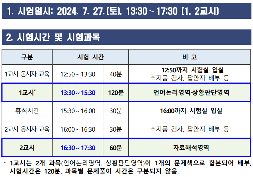 1교시(언어논리영역, 상황판단영역)는 13시 30분부터 15시 30분까지 120분간, 2교시(자료해석영역)는 16시 30분부터 17시 30분까지 60분간 치러진다.